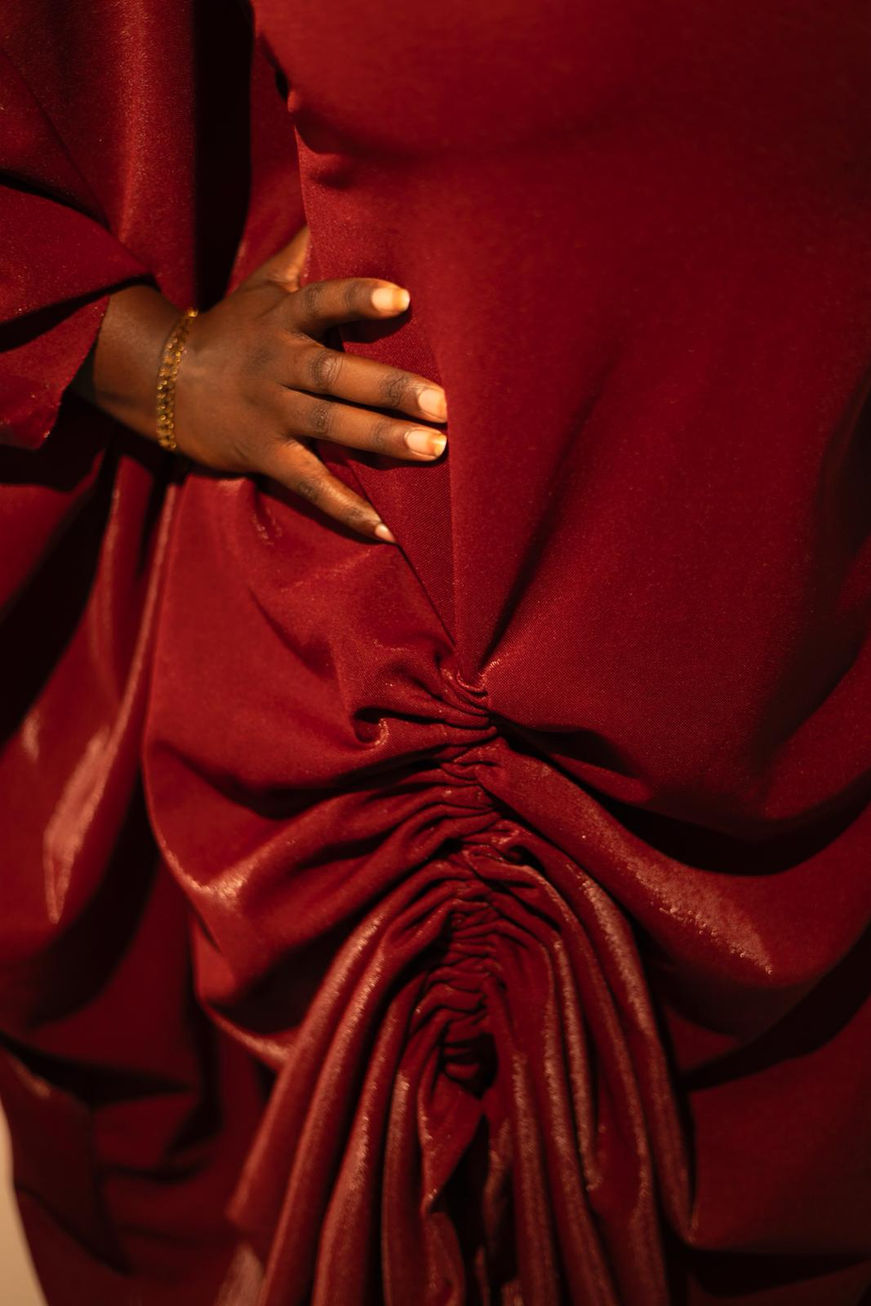 Un kimono maxi strutturato, con taglio ampio e maniche extra large, indossato sopra pantaloni palazzo. Il drappeggio laterale dona movimento e definizione. Un capo dallo stile etereo, perfetto per cerimonie o eventi di alta moda.